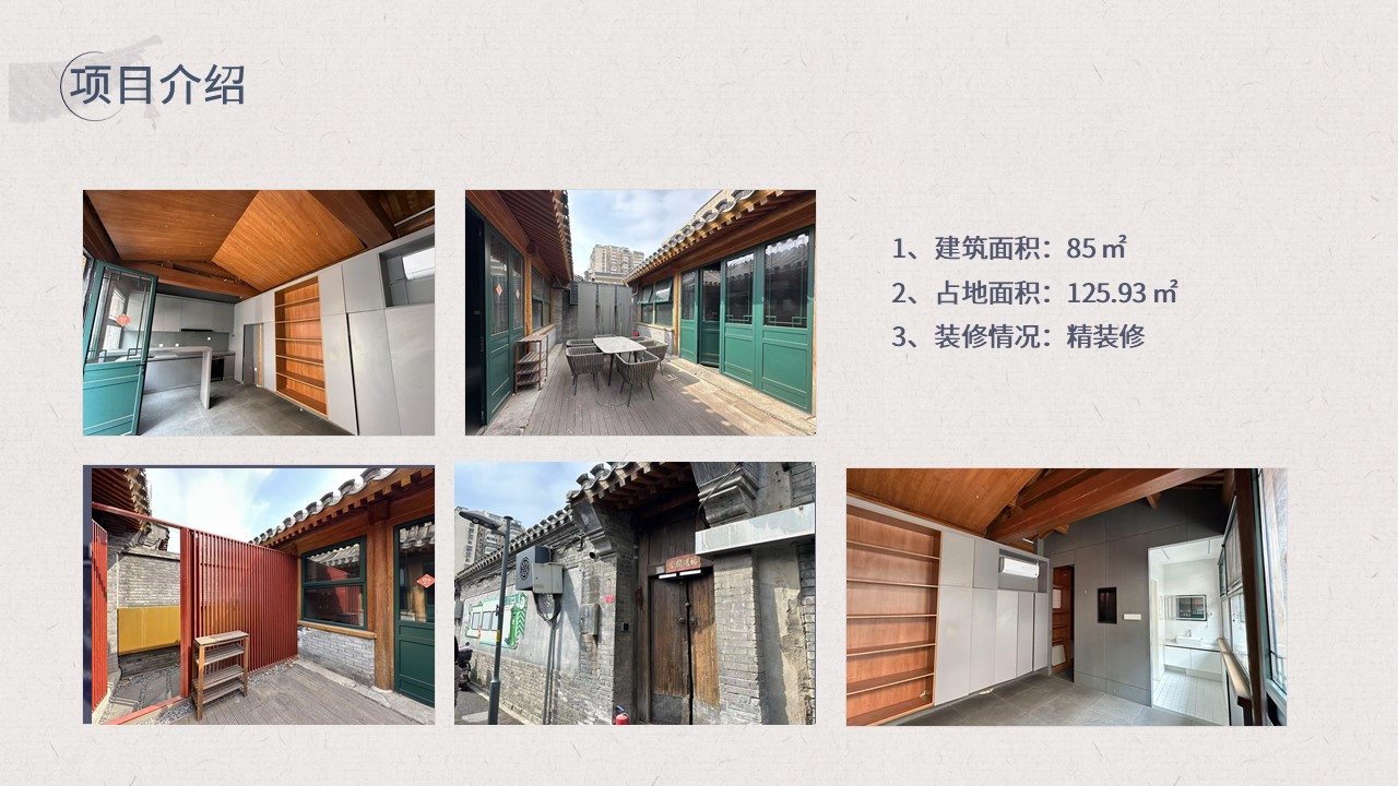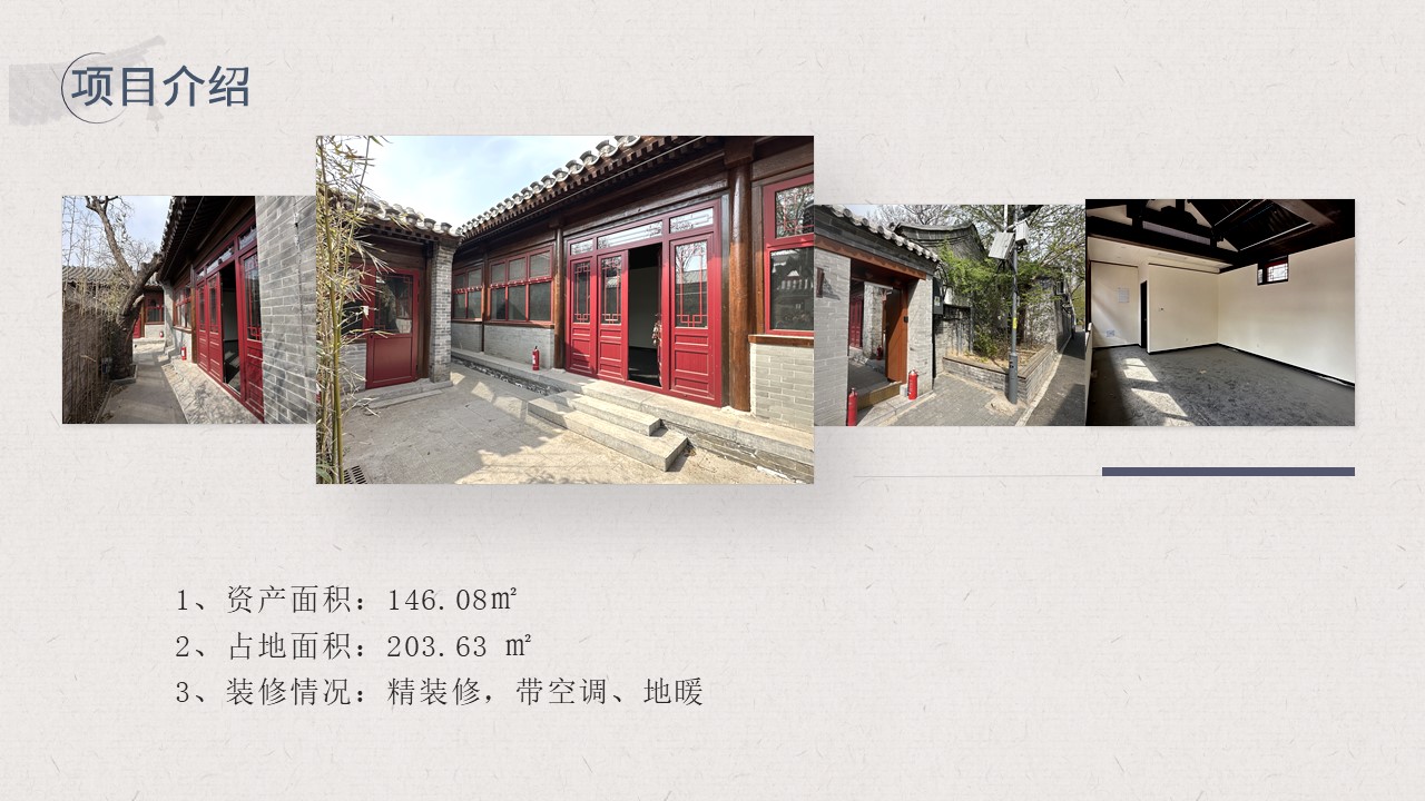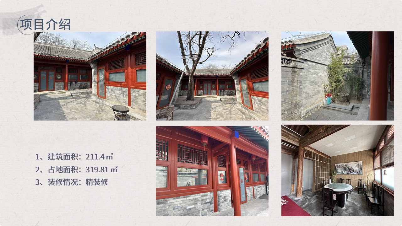 (1)标的资产位于北京市西城区菜市口附近,地处城市西南部的交通核心地带,与宣武门外大街、广安门内大街、骡马市大街相连,是连接京城内外的重要交通节点,地铁4号线菜市口站及多条公交线路(如5路、6路、48路、57路)在此交汇,极大提升了区域通达性。(2)三处四合院建筑面积分别为146.08㎡、85 ㎡、211.4 ㎡,精装修。