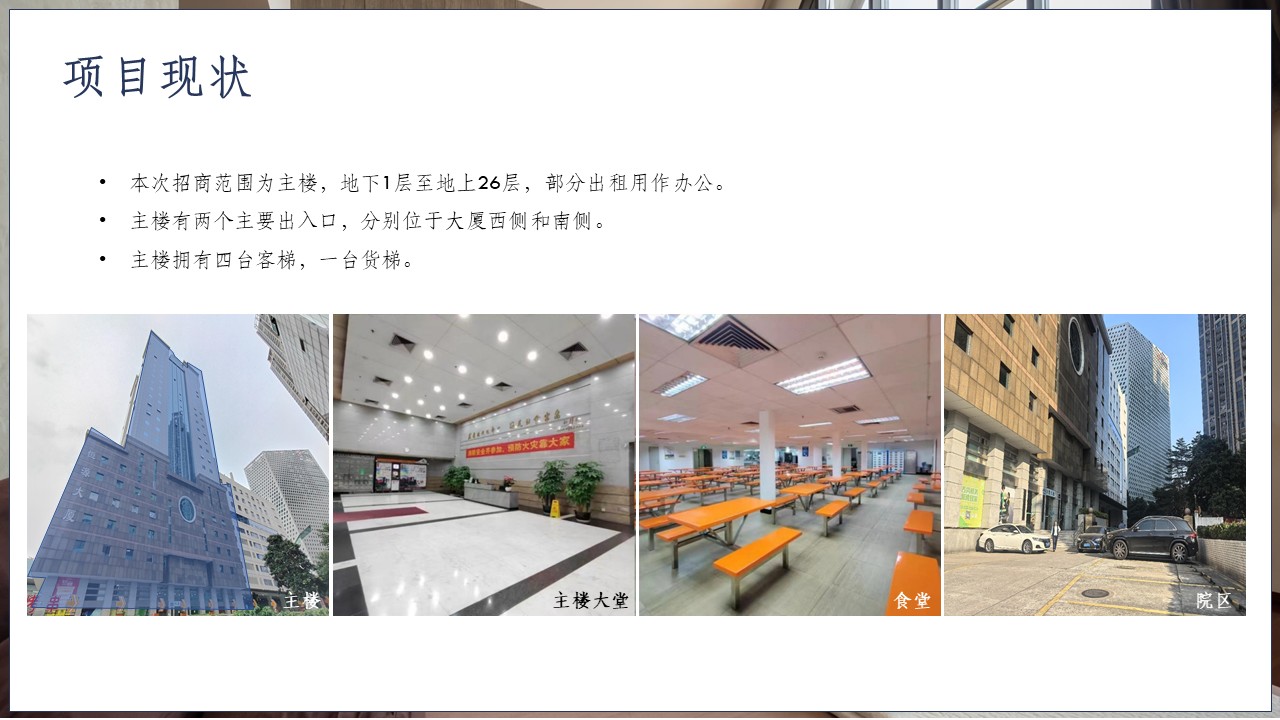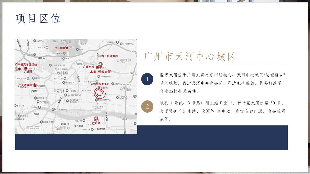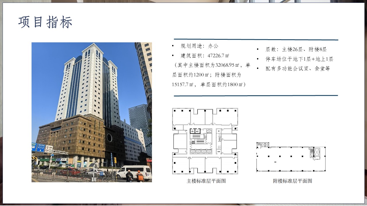 恒源大厦位于广州东部交通枢纽核心、天河中心城区“站城融合”示范板块,靠近天河中央商务区,周边配套成熟,具备打造复合业态的先天条件。地铁 1 号线、3 号线广州东站 F 出口,步行至大厦仅需 50 米。大厦紧邻广州东站、天河体 育中心、东方宝泰广场,商务氛围浓厚。项目建筑面积:47226.7㎡(其中主楼面积为32068.95㎡,单层面积约1200㎡;附楼面积为15157.7㎡, 单层面积约1800㎡),规划用途是办公;主楼26层、附楼8层,停车场位于地下1层+地上1层;配有多功能会议室、食堂等。